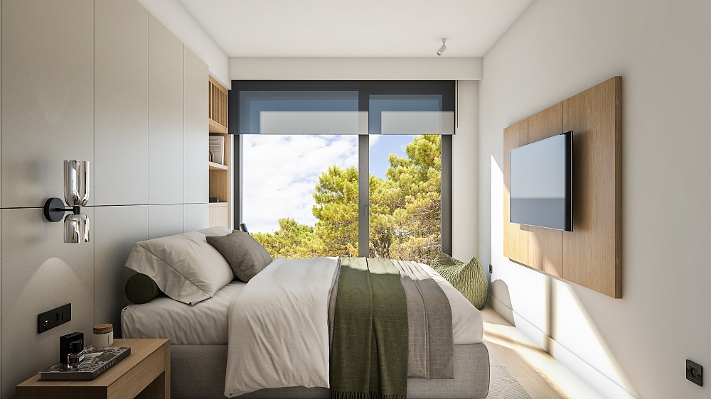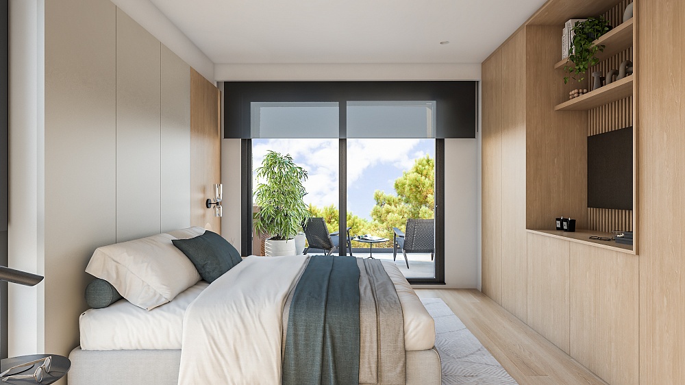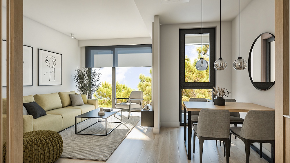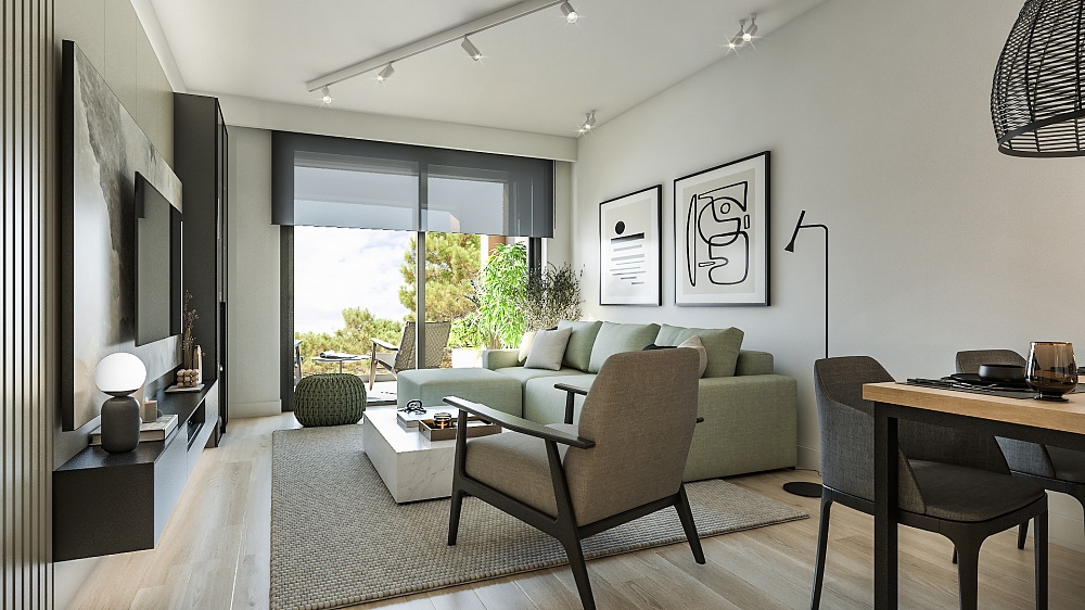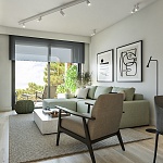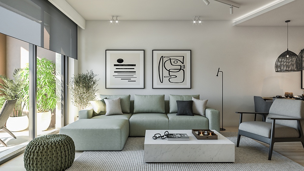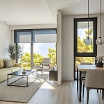 Структура апартаментов: 1 или 2 спальни, гостиная открытой планировки, кухня с обеденной зоной, прачечная, 1 или 2 санузла. У всех апартаментов есть выход на террасу.