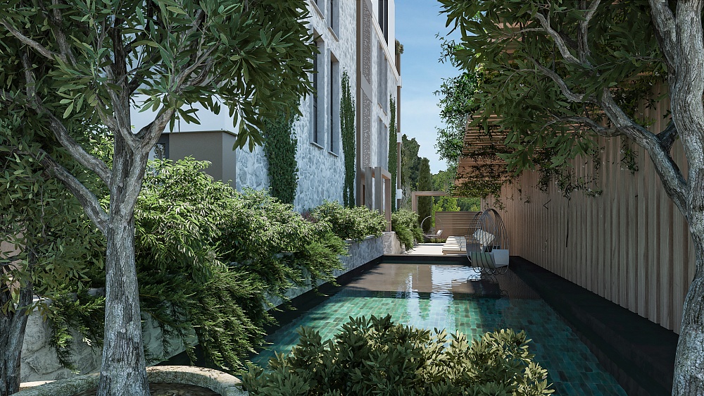 Круглогодичный бассейн с подогревом, архитектурно оформленным садом и зонами отдыха.